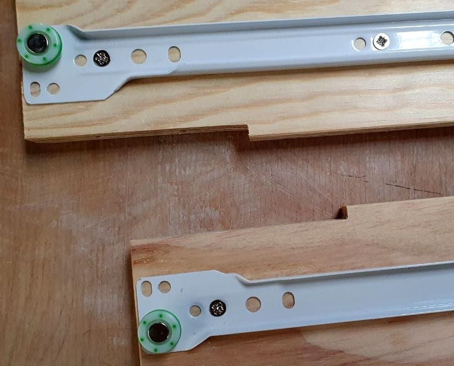 Schubladenschienen richtig positionieren, dabei auf die Holzausschnitte der Seitenteile CR1 und CR2 achten