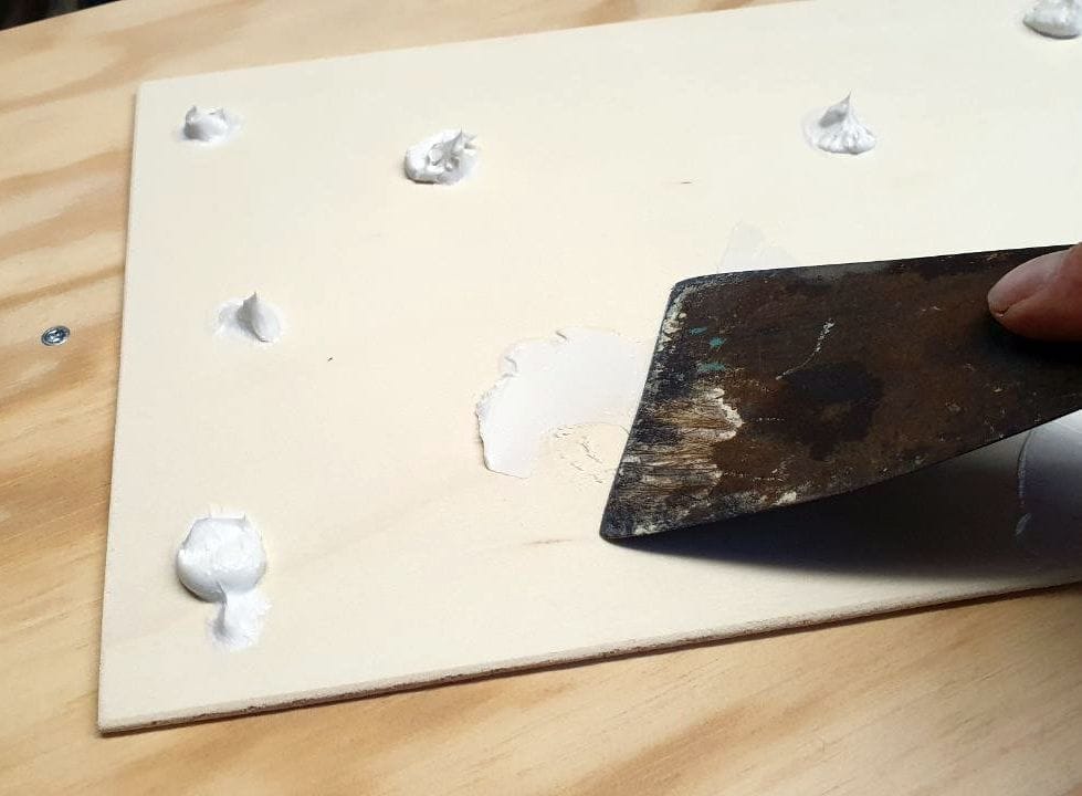 Nach der Verschraubung der Schubladenfrontplatte C5 wird Leim auf die Blende C6 aufgetragen, am besten mit einer Spachtel verteilen.