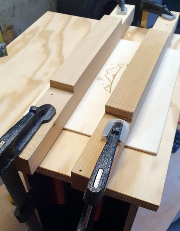 Damit die Platte fest klebt, muss diese angedrückt werden, eventuell mit einem Gewicht oder mit Schraubzwingen, wie abgebildet.